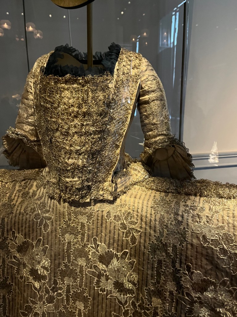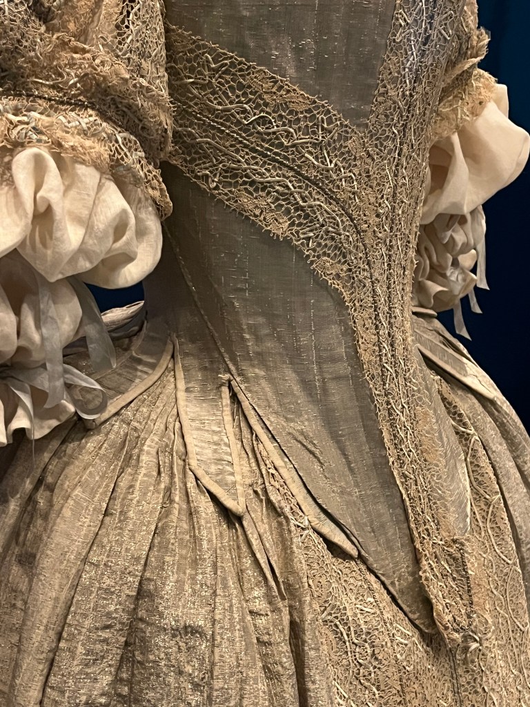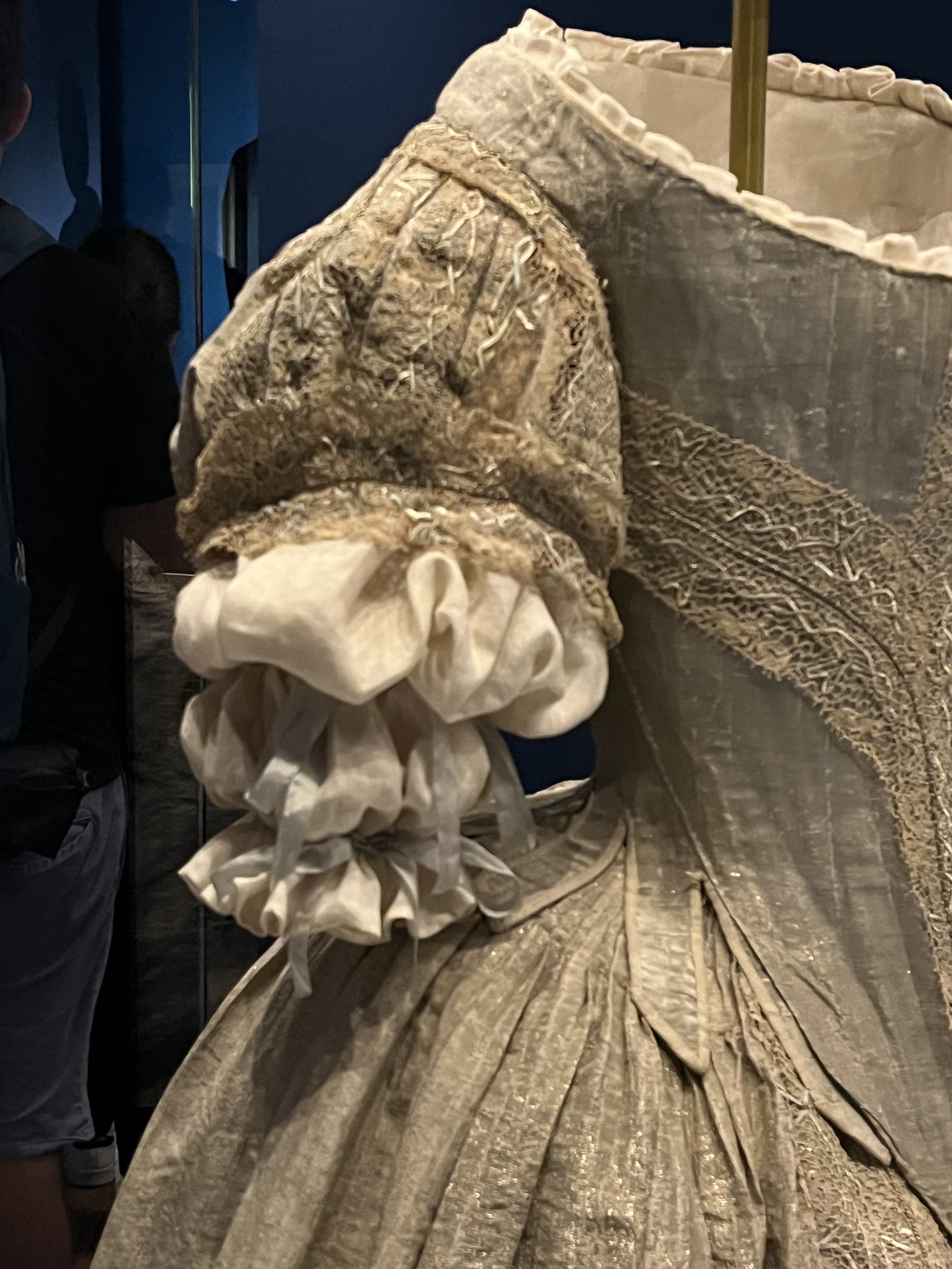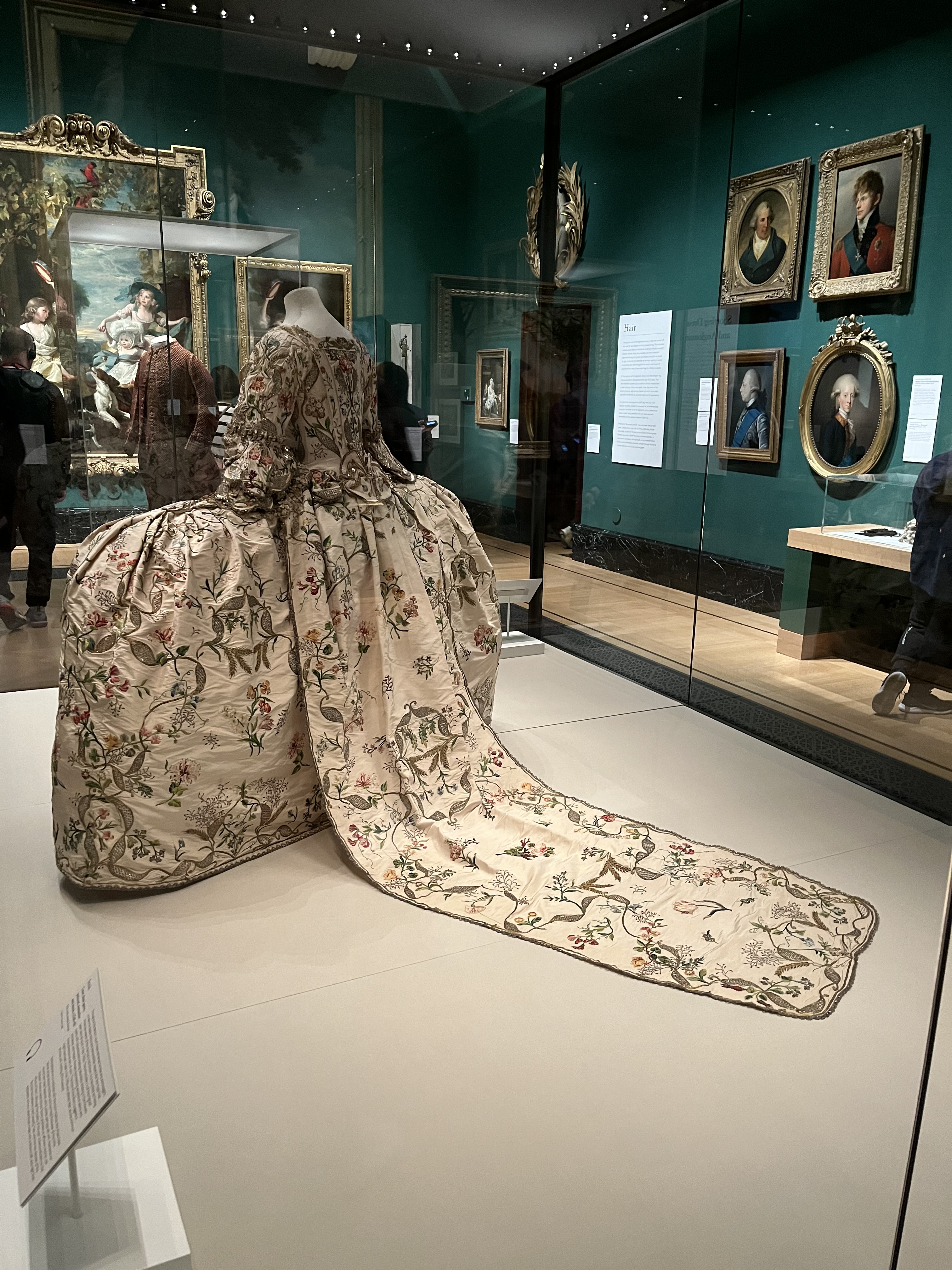 This exhibition has TWO such gowns. The 1660 gown above, and the Rockingham Mantua (part of the Royal Collection Trust collection). I was intrigued to overhear other visitors’ comments that these must have been gowns for “a queen”. They are stunning, but not that stunning – the queens would have been encrusted with actual jewels. That the dresses were worn by “mere” (ha) nobles does not change that they are remarkable survivals (and that their delicacy means this was a rare chance to see them mounted and on display).