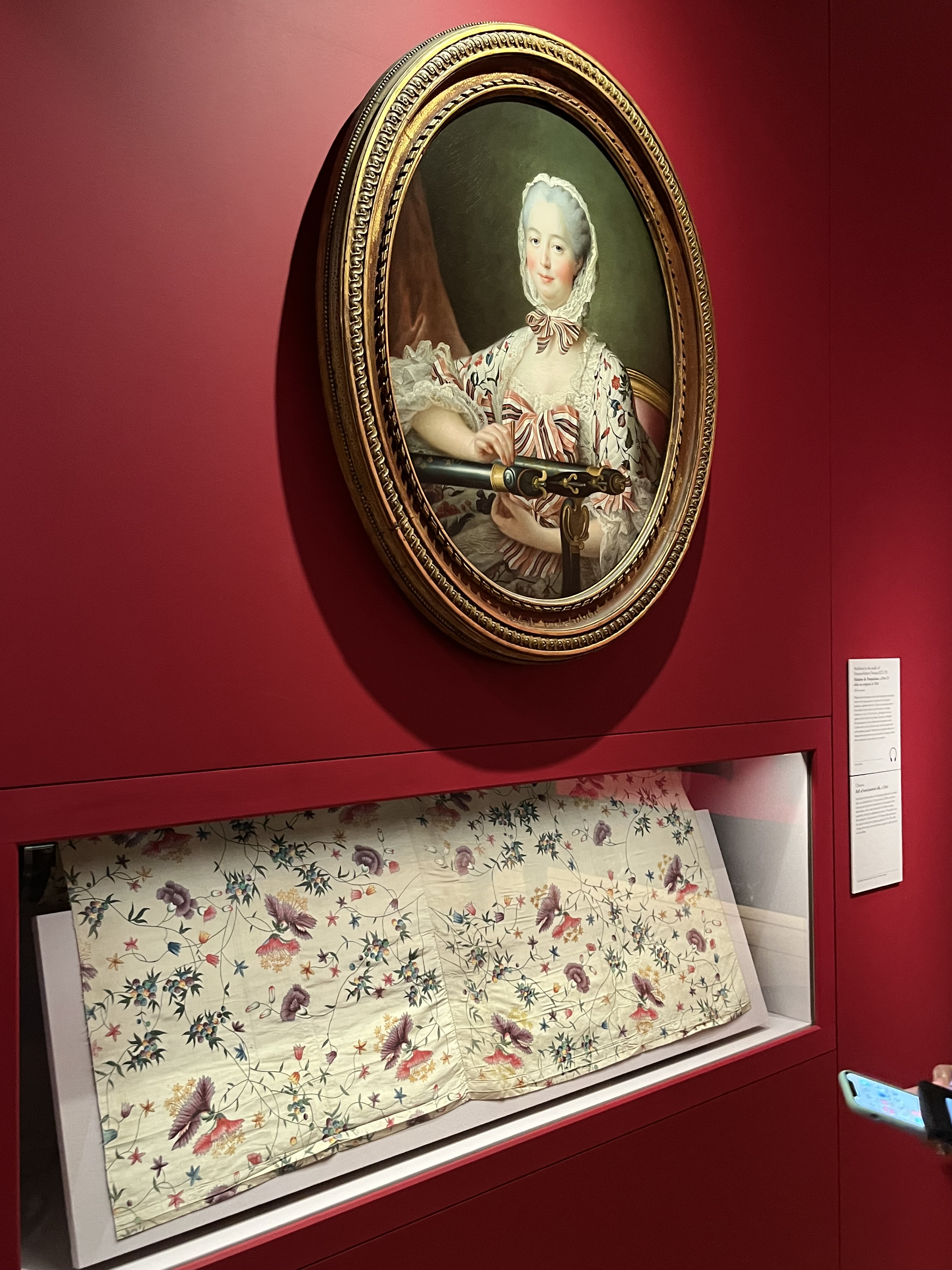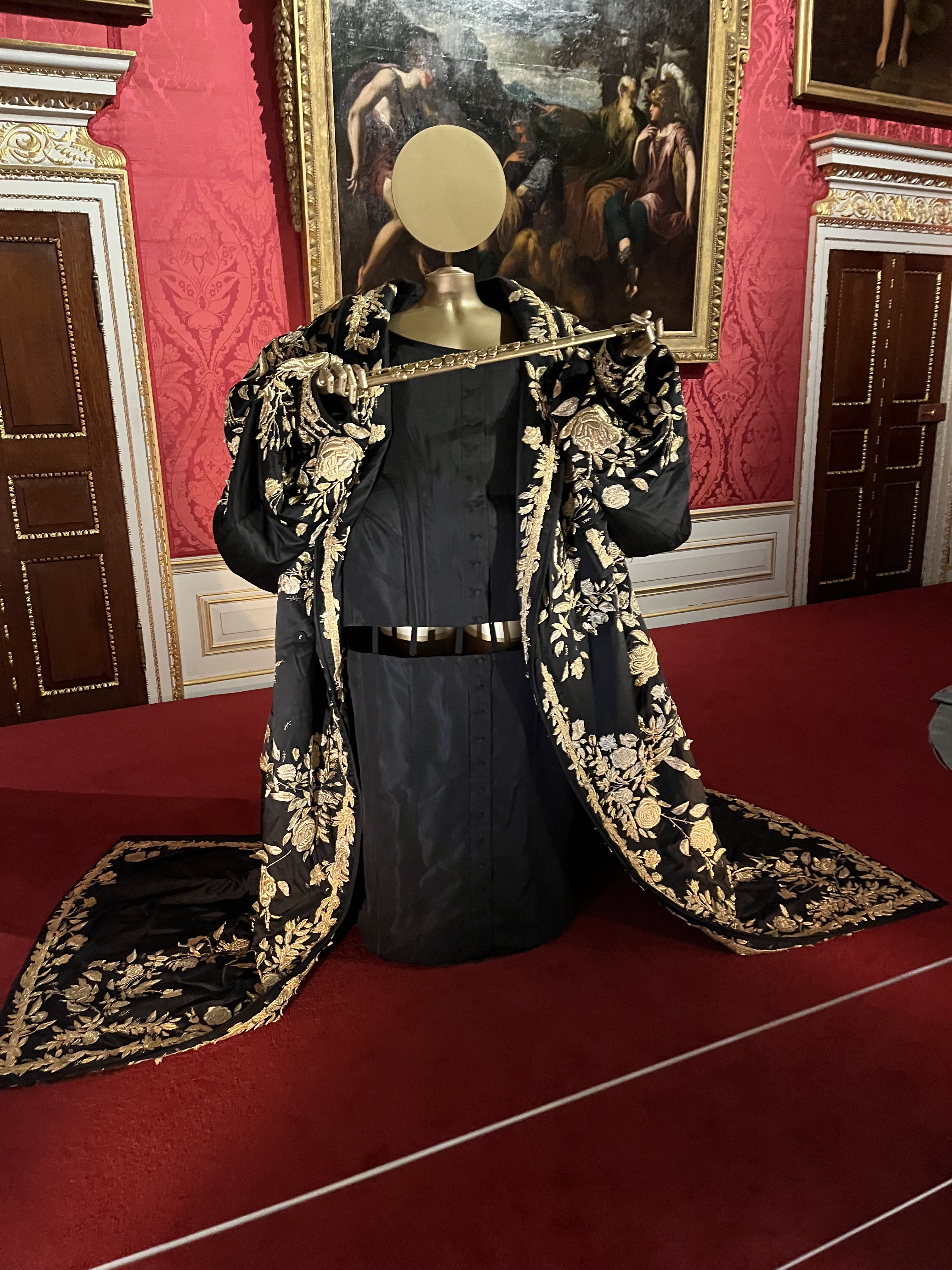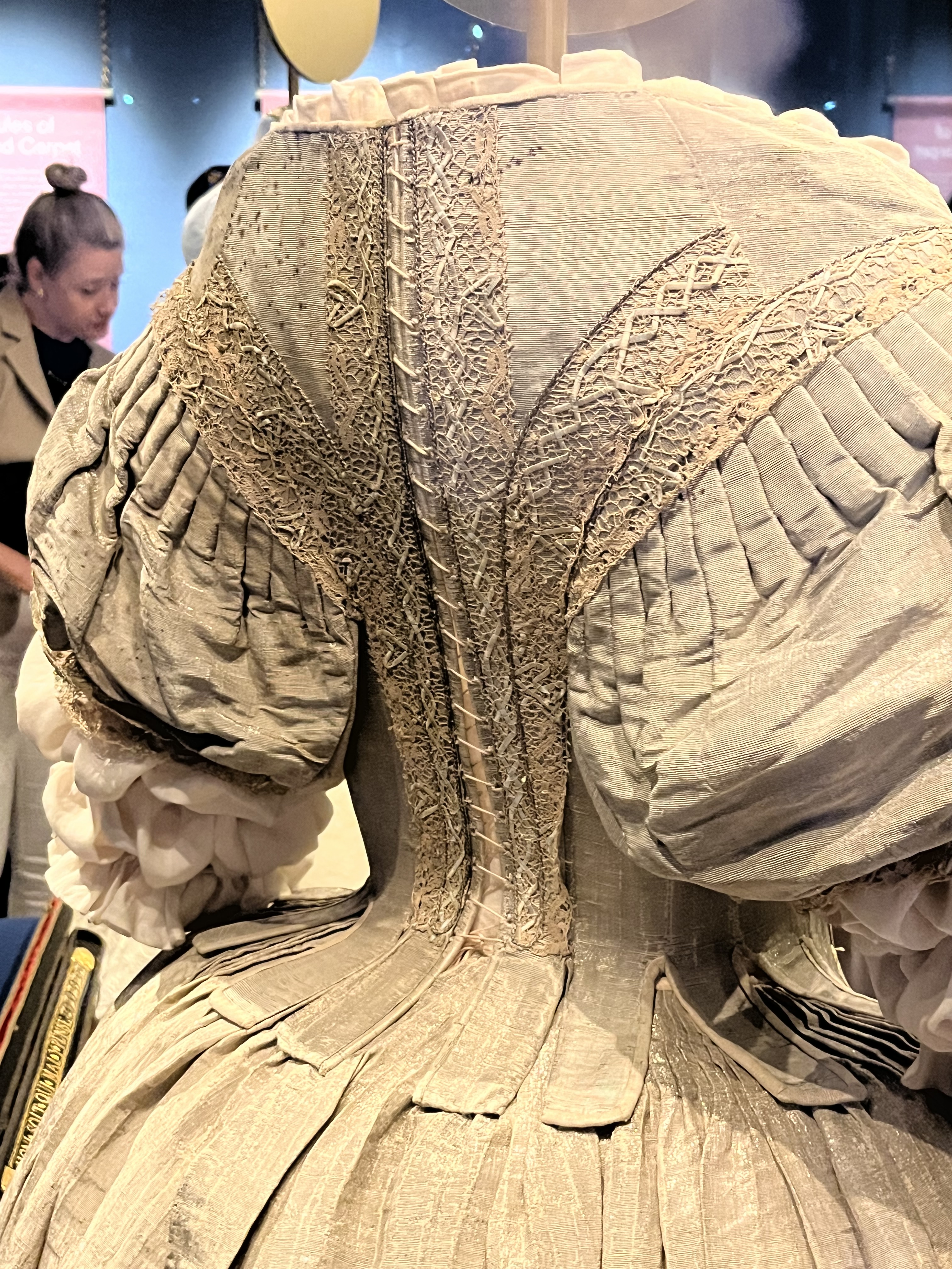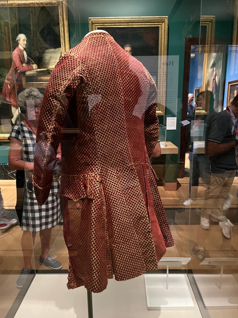 This exhibition has TWO such gowns. The 1660 gown above, and the Rockingham Mantua (part of the Royal Collection Trust collection). I was intrigued to overhear other visitors’ comments that these must have been gowns for “a queen”. They are stunning, but not that stunning – the queens would have been encrusted with actual jewels. That the dresses were worn by “mere” (ha) nobles does not change that they are remarkable survivals (and that their delicacy means this was a rare chance to see them mounted and on display).