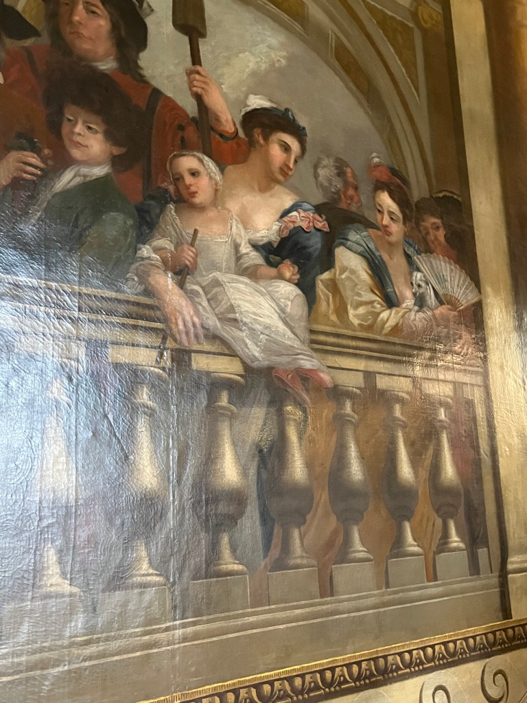 But I was very impressed with a number of elements of the exhibition. The visual cues there to help the visitor follow the show’s thesis, if you will. The most impressive, was that they led visitors up the King’s Staircase with red carpet commentary, and upbeat modern music in the background. The staircase was painted by William Kent for George I when he renovated the palace in the 1720s, and Kent used actual palace servants as his models. The Beefeaters depicted would have been recognizable guards permitting or denying admittance to courtiers trying to gain access to the Royal drawing rooms. There is Peter the Wild Boy, the king’s personal servants of Turkish origin: Mustafa and Mohammad.