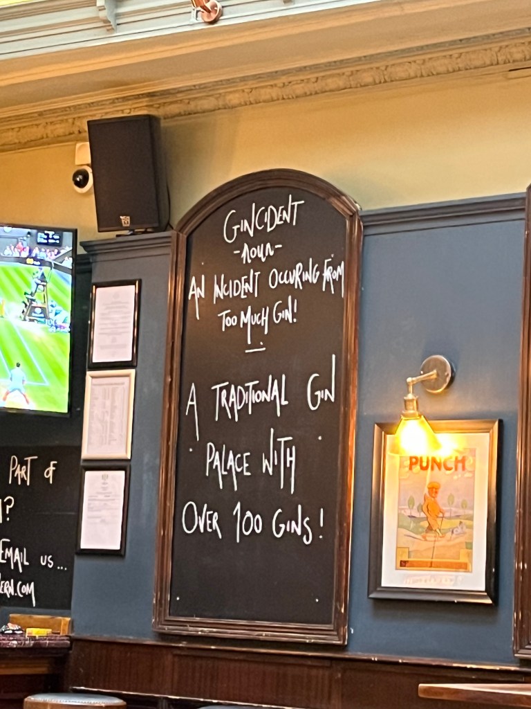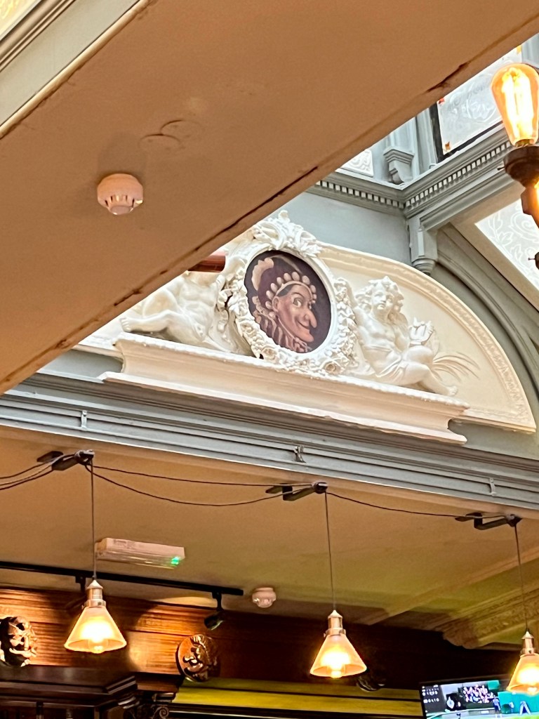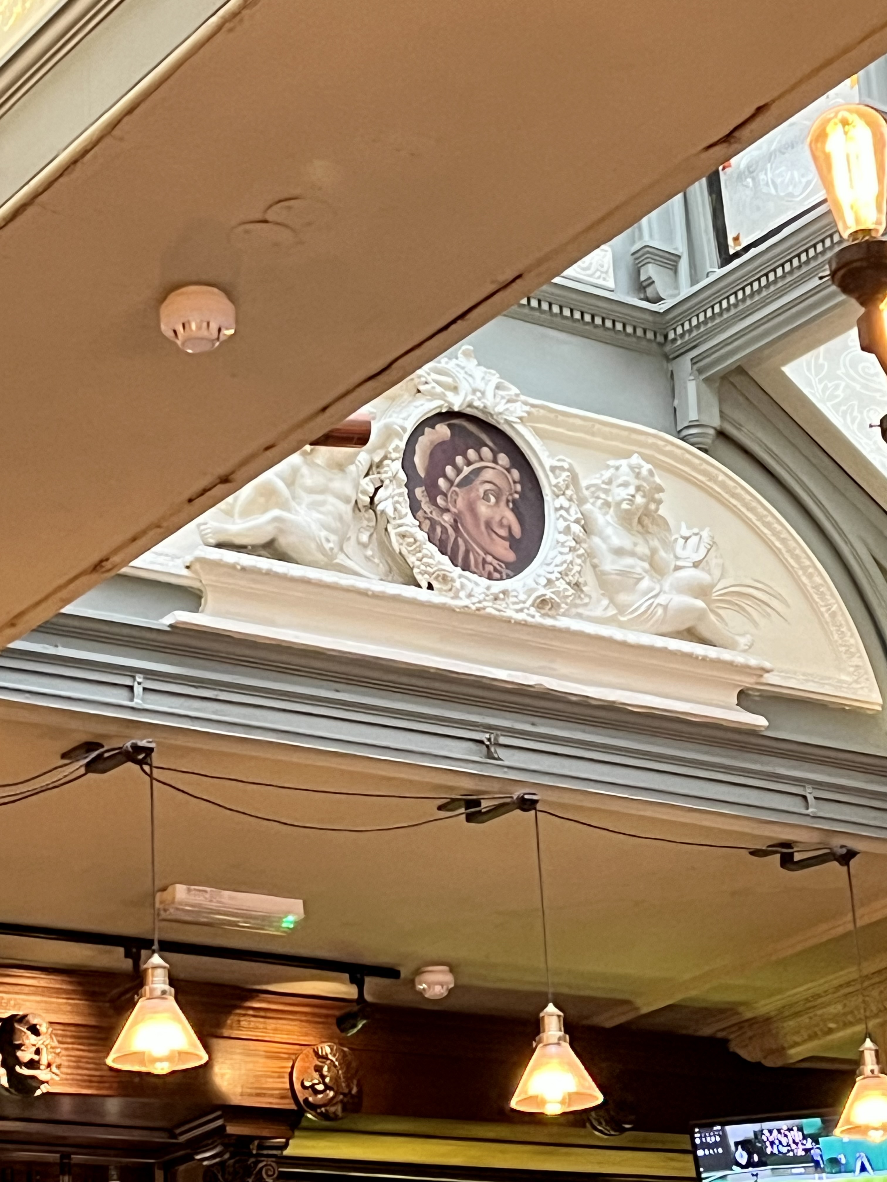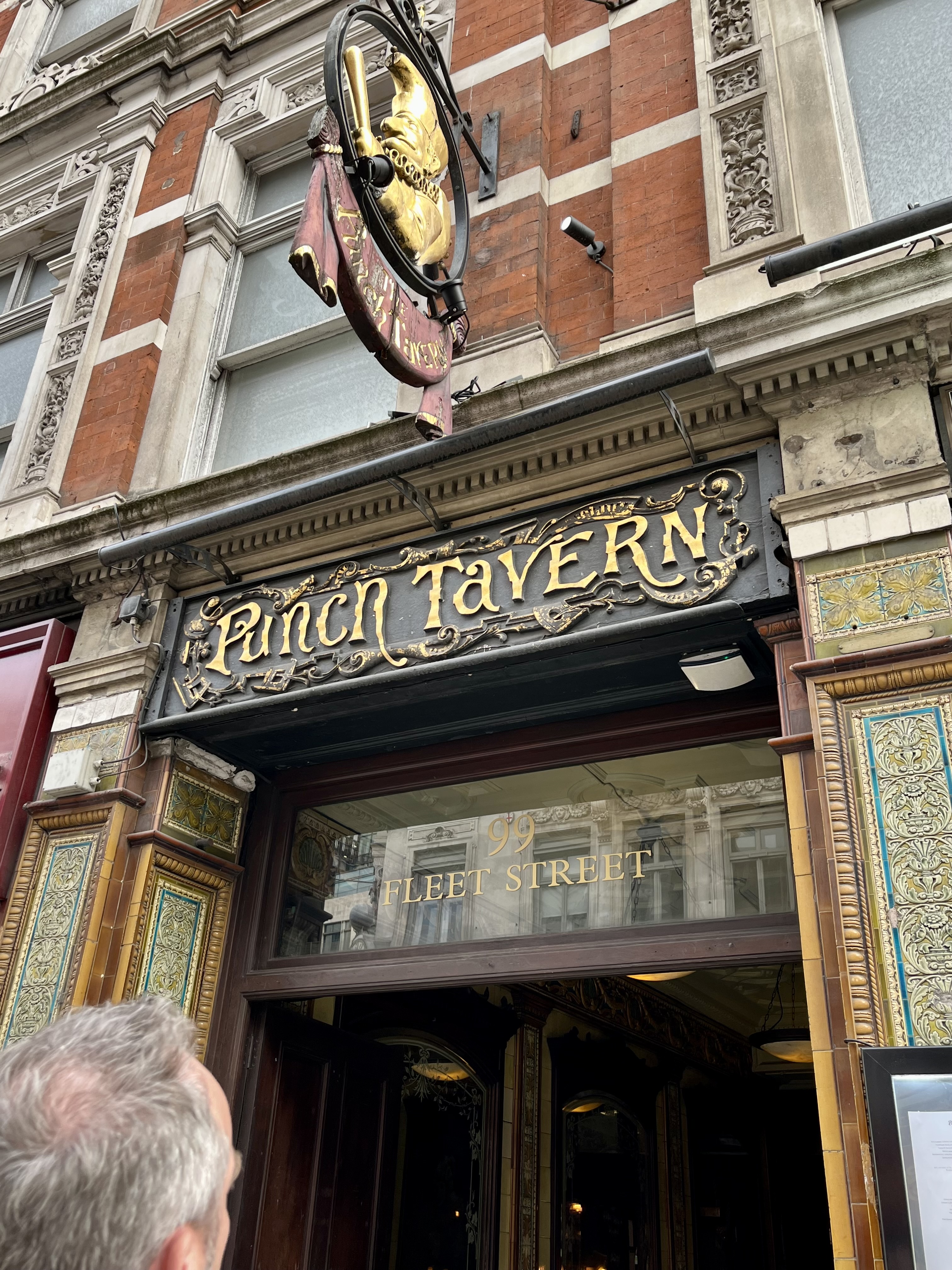 I did venture out one last time, for dinner in a pub on Fleet Street, just up from my hotel (right across the way from the Blackfriar pub and the station): Punch Tavern. A former 19th century gin palace originally called the Crown and Sugar Loaf, in the 1840s it changed its name to honor the popular magazine that had its headquarters just up Fleet Street. The décor is appropriately glorious.